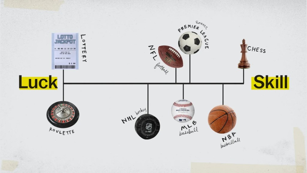 - I think the analysis is cool, but should perhaps be explained better. In particular, I think it’s important to note that it is not a description of how much skill contributes to the outcome in that type of game generally, but rather how much the ‘relative’ differences in skill ‘within a league’ contribute to the outcomes in that league compared to random variance (i.e. luck). In other words, if you imagined a league where every team was equally skilled, this analysis would correctly show that the outcomes of their games were 100% determined by luck (as they are all equally skilled!). As such, balancing mechanisms such as salary caps and restrictions on free agency would lead to more balanced leagues and thus a LOWER contribution of relative skill differences between the teams towards the game outcomes. So the NFL having a lower rank compared to basketball may be due to a greater influence of luck in season rankings, or be due to the teams having better skill balance overall due to league rules (Miami Heat Big Three, an example of poor league balance imo). They also do emphasize that the length of the seasons contribute greatly, as the 16 games in the NFL will be more prone to the vagaries of random chance than having 162 total season games in the MLB.